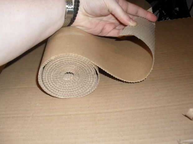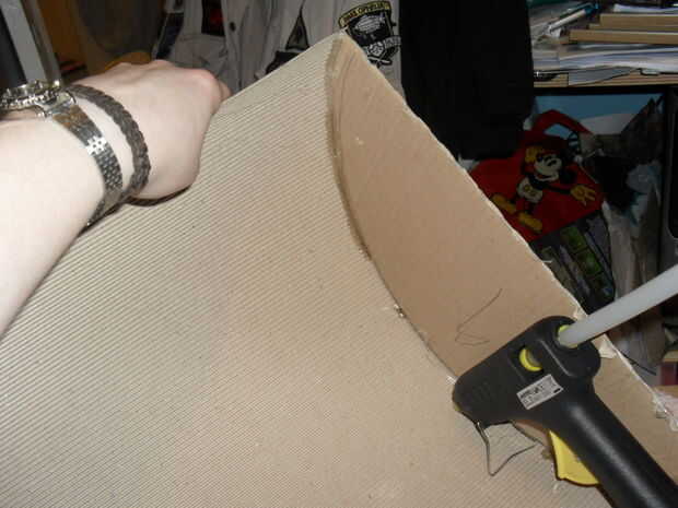 Comience con un extremo del rollo de cartón y emparejar a una esquina del borde de la tapa. Pegamento a lo largo de la costura interior de los dos bordes. cuando han pegado a lo largo de la longitud del borde curvo deja 2inches o para usar como una bisagra