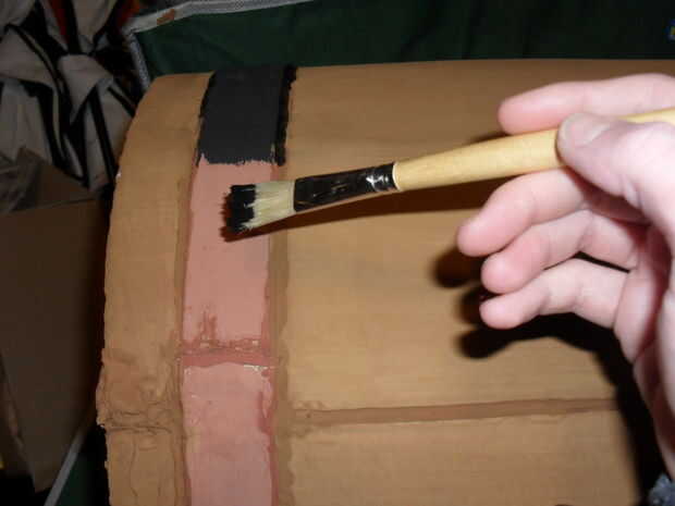 Una vez que todo se seca, es hora de empezar a pintar... Hice dos capas de pintura de carteles, uno de burnt Siena y luego uno de marrón. Luego pinté las bandas negras. No te preocupes demasiado mucho sobre los bordes... nos va bastante les hasta en un momento