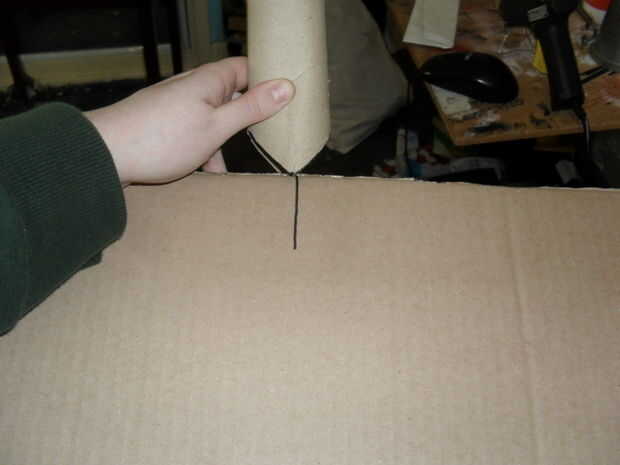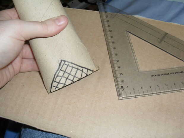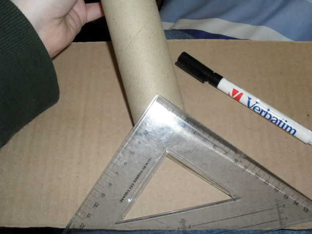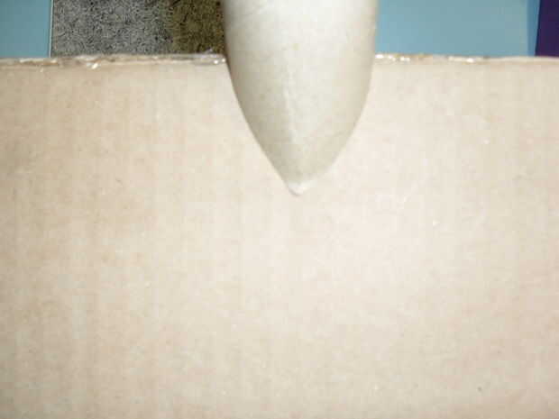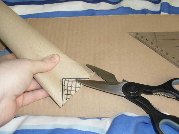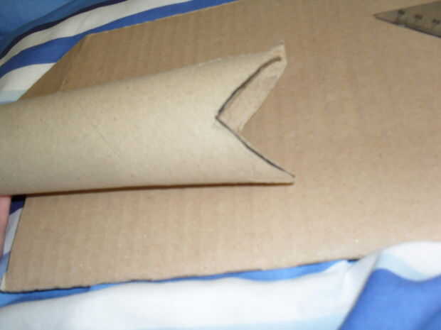 Marcar y cortar un triángulo de 90 grados de un extremo del tubo de cartón, voltee la artesa para que se vea como un revés en forma de V, encontrar el centro de la artesa y marque con el lápiz... Ajuste el cartón del tubo para que las formas V usted ha sólo recortar línea hacia arriba con la línea sólo se han acercado y el pegamento en su lugar.