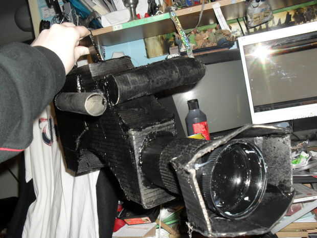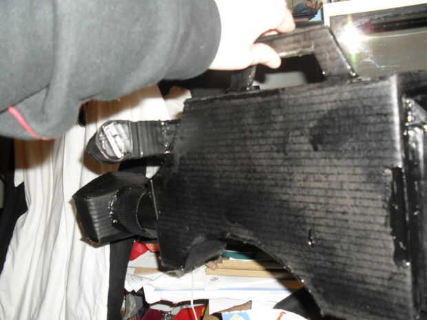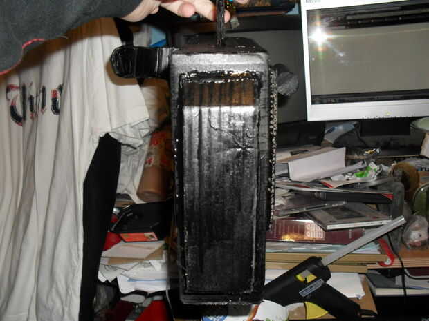 Para este paso sugiero que vayas fuera poner ropa vieja e ir tuercas con su elección de pintura en aerosol... Tenía grandes designios de hacer toda clase de efectos de pintura pero lamentablemente se quedó sin tiempo, sólo rocía todo en la pintura de aerosol negra más barata que pude encontrar. Cartón bebidas realmente la pintura, por lo que puede para darle unas cuantas capas.