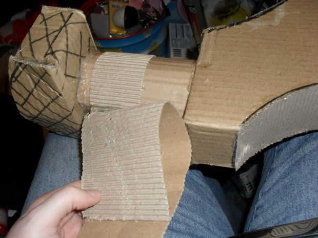 Esto es un poco simple de detalles que probablemente no se verá pero agregué, porque sabía que sin él, no quiero la pieza... Tomé algunos de los envases corrugado cartón que utilizamos en el paso 3, cortar a la mitad del ancho del tubo del cartón y tan largo como la circunferencia de los tubos. Luego pegué abajo... actúa como lo doodad chueco que los hombres de la cámara zoom o cambiar el foco, o lo que sea.