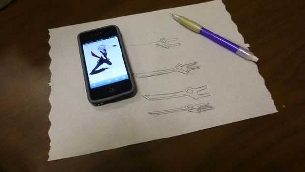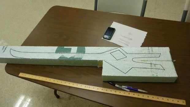 hacer esta espada necesita una espuma de 8 por 11 láminas, cinta adhesiva, un cuchillo del exacto o sierra de mano, pintura en aerosol negro (plata trabaja demasiado) y palillo en las joyas son opcionales.Paso 1: El esquema Usted tendrá que encontrar