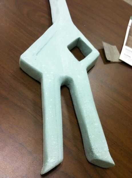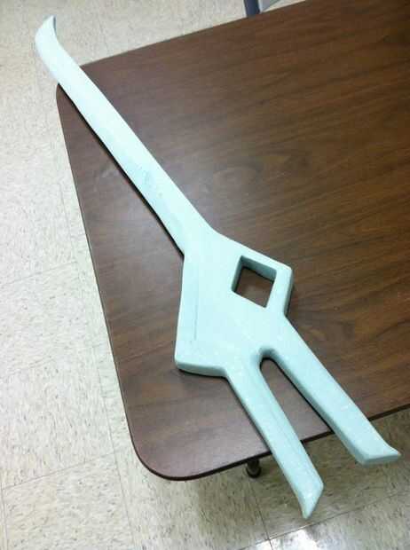 mira bastante áspero. Para solucionarlo yo solo lijar todo con lija. Empecé con una lija de grano medio y había alisado todo y había redondeado de los bordes. Este es también donde usted querrá darle ningún detalle. Esta espada no requiere mucho detalle pero solo parecía tan normal que tenía que hacer algo. Sólo utilicé mi papel de lija para pulir un poco la espuma y dejar una cresta a lo largo de la guardia. Es difícil de hacer en el cuadro pero comienza en la hoja y va a la parte inferior de la guardia.