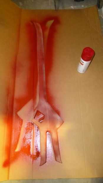Para esta espada no molestarse con algo de fantasía porque es simplemente rojo. Se trató de rociar la pintura en capas delgadas y en su mayor parte funcionó... hasta que me puse impaciente. Pero sobre todo es justo en una parte. Después de spray pintado me seco cepillado algunos pintura acrílica negra en el detalle por lo que estaría parado hacia fuera un poco más.
