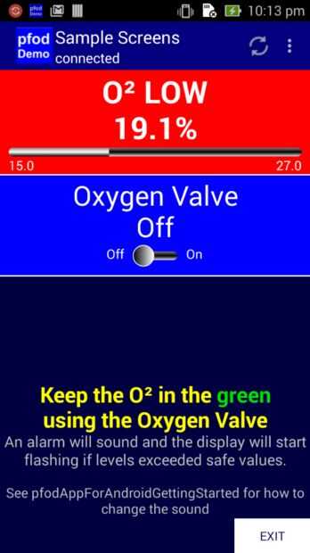 Ahora que ha definido el sonido para la conexión de "Pantallas de muestra", haga clic en este nombre de la conexión, o simplemente salir y reiniciar la aplicación pfodDemo, y usted verá la pantalla principal de pfodDemo. Desde esa pantalla Seleccione el botón de "Menús y listas". De esa lista elegir el ejemplo de Control de oxígeno.