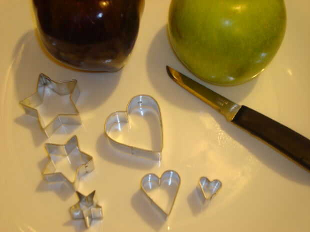 Nota: la primera vez que hago esto necesita manzanas extras porque es difícil de usar el cortador de la galleta.  Pensé en manzanas extras por ello.