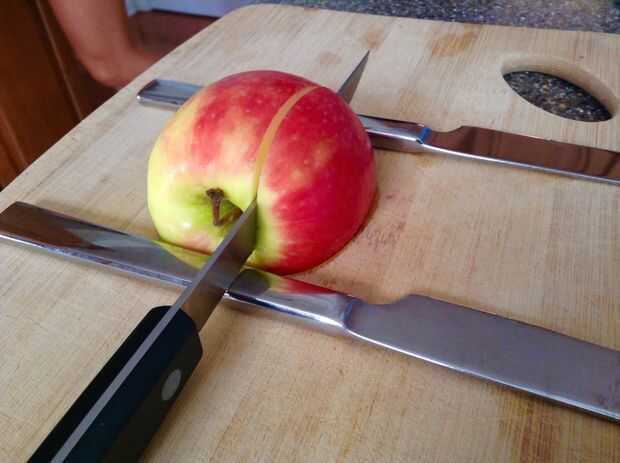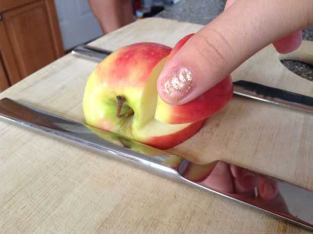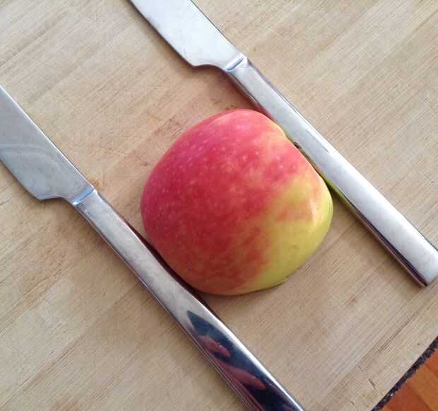 Poner dos cuchillos de mantequilla en la parte superior e inferior de la manzana.
