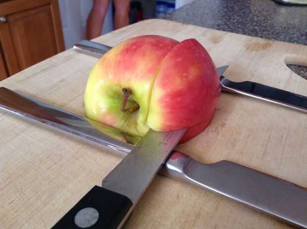 Corte hacia abajo aproximadamente 1/3 del camino a través de la manzana y los cuchillos de mantequilla se detendrá de corte completamente a través.