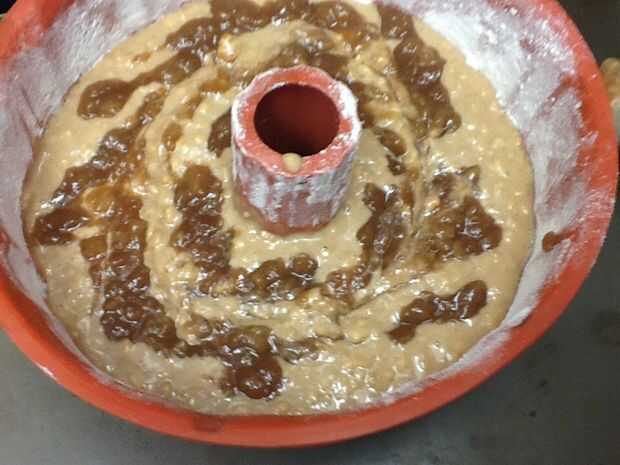 7. Vierta 2/3 de la mezcla de pastel en el molde.