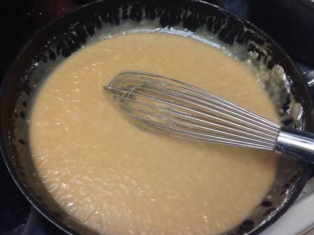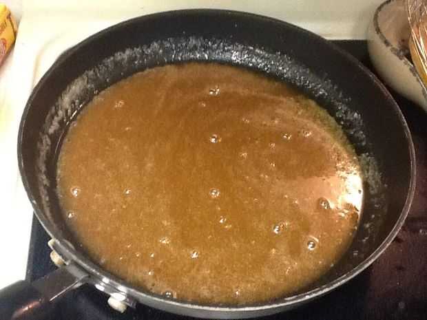 1. poner 1/2 taza de azúcar morena, 1/4 taza de mantequilla y 3 cucharadas de leche a hervir en una cacerola mediana sobre fuego medio, removiendo constantemente; hervir 1 minuto, batiendo constantemente.