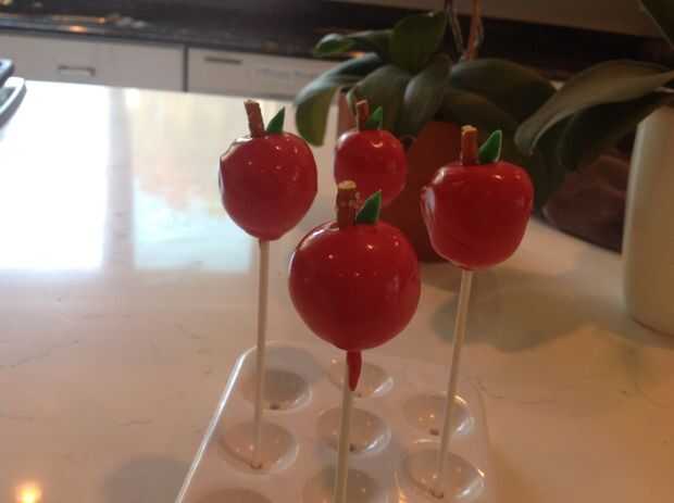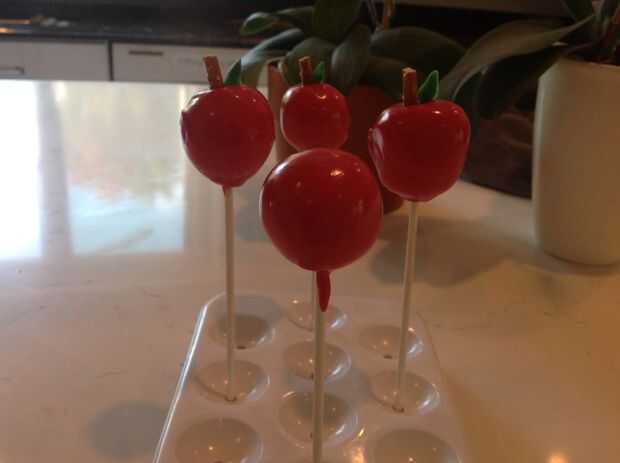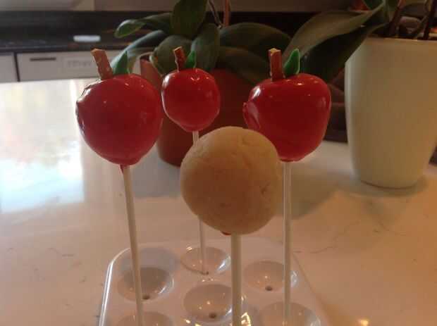3. mientras el cake pop es mojada con el derretimiento de caramelo rojo, empujar suavemente el pretzel "tallo" en el cake pop y palillo en la "hoja". Si usted está confundido, mira la última foto para ver cómo el resultado final debe parecerse.