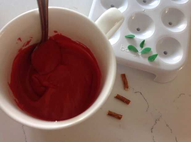 1. Agregar 1 1/2 cucharadas de aceite a los derretimientos de caramelo rojo y revolver bien. Esto hace que los derretimientos de caramelo líquido-y más y más fácil trabajar con. A continuación, retire las hojas verdes de la bolsa de ziplock y prepárate decorar!