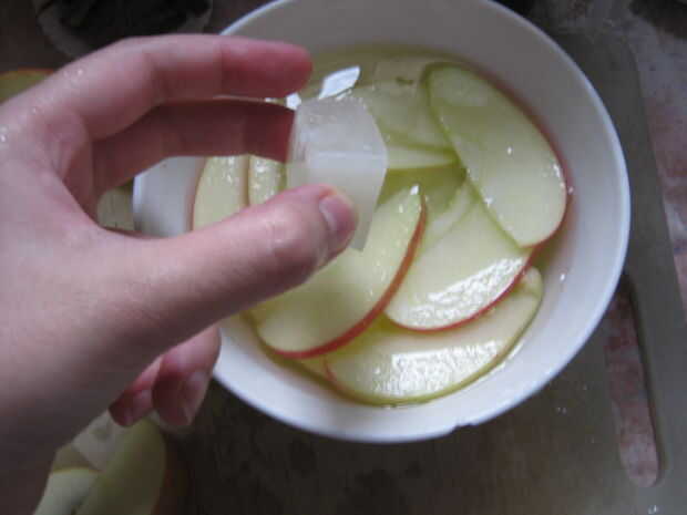 Añadir un cubo de limón (o jugo de limón) a poco de agua y sumerja sus rebanadas picadas.