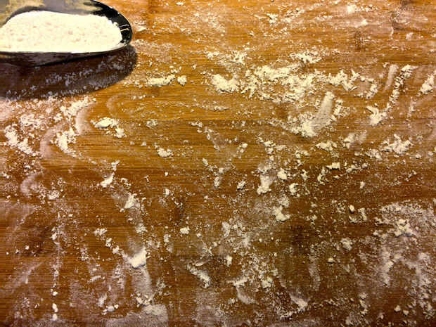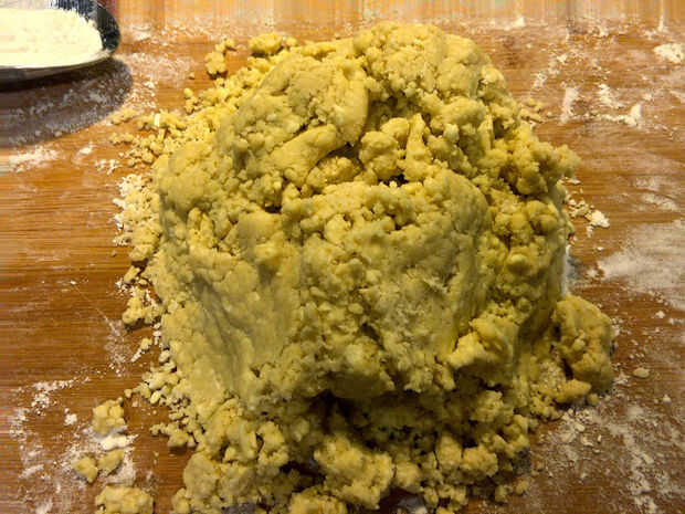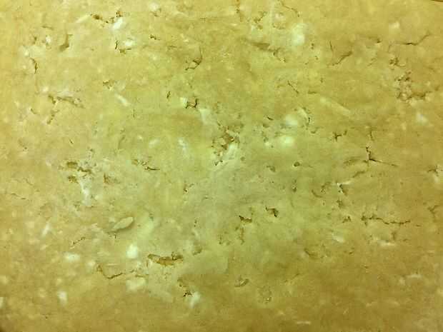 Volcar sobre una tabla enharinada y rodar en una bola o dos bolitas, los aplanar ligeramente. Deben ser capaces de ver pequeños trozos de mantequilla moteado la masa. Esto es algo bueno. Estos pequeños pedacitos de mantequilla se extenderán en capas como la corteza se cocina para que tenga una corteza escamosa!