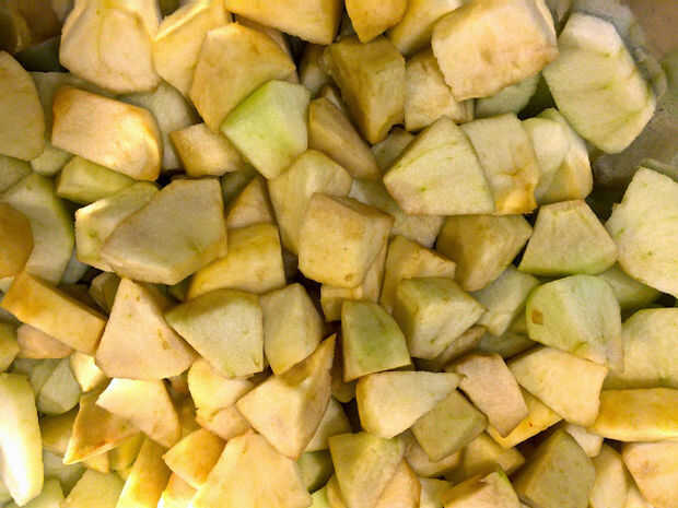 Corte cada cuña en trozos de tamaño más grandes, colocar en un recipiente más grande.