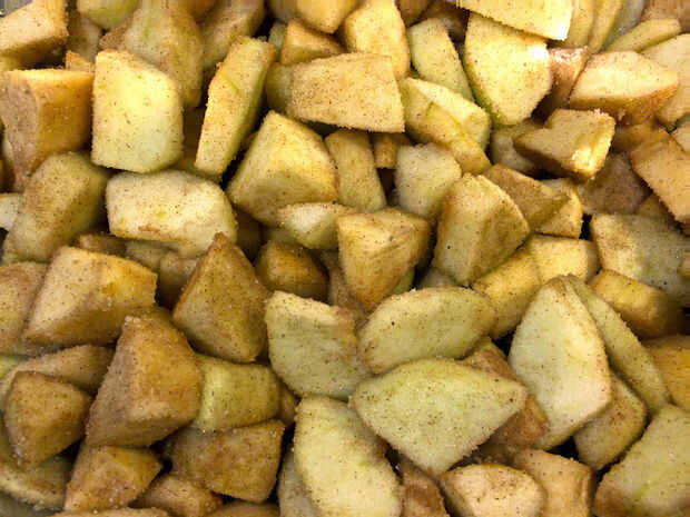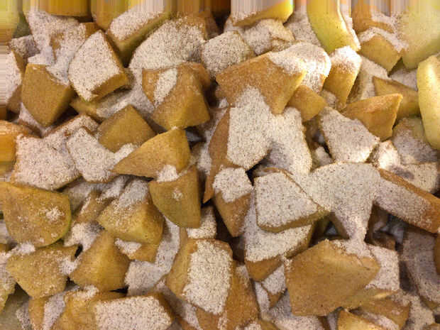 Combinar la mezcla de azúcar con las manzanas, mezclar hasta para cubrir uniformemente las manzanas. Enfriar en el refrigerador, para mantener las manzanas frío.