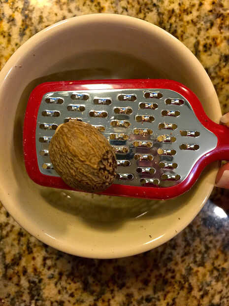 En un bol grande, tamice dos veces el azúcar, sal, harina, nuez moscada recién rallada y canela. Ponga a un lado.