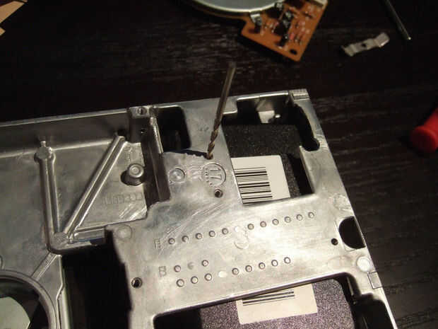 Después de algunos jugando, he encontrado un buen lugar para la alimentación que requieren solo mínima modificación de la estructura interna de la unidad de disquete.