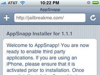 2. Goto http://jailbreakme.com/, Desplácese hasta la parte inferior, haga clic en instalar AppSnapp Safari saldrá y regresará a su trampolín. Diapositiva para desbloquear, son ahora jailbreak y son capaces de utilizar el "Installer.app"...