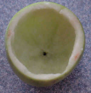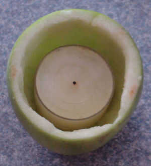 Para ahuecar la manzana que tendrás que utilizar los mismos principios como una calabaza, cortar la parte superior y luego ahuecar - el melón debe trabajar muy bien para ahuecar la manzana, lo sentimos no hay ninguna foto de 'Acción', que estaba haciendo esto por mi cuenta.
