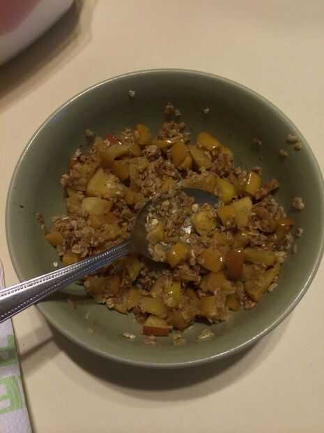 Cuando sale, la avena será todavía secos, revuelva en la mezcla de mantequilla/apple/almibar. Llamo esta un poco fresco, ya que la avena no la costra como lo haría en el horno. Sin embargo, todavía es muy sabroso, y la avena da una agradable textura masticable.