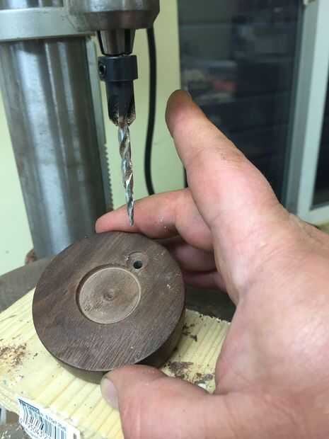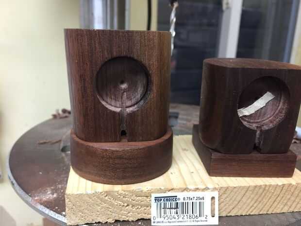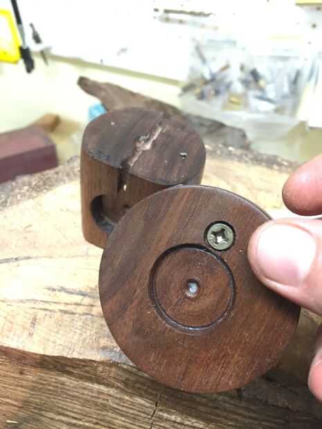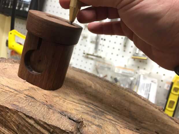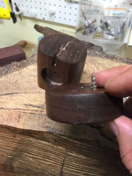 La clave de la base es montar con un tornillo como una bisagra. Alinee sus granos de madera como te gusta y decide donde los lados y el frontal y posterior de la base. Perfore y abocarde un agujero en el desplazamiento de la parte inferior unos 3/4 de pulgada a un lado. Ahora utilizar un punzón o un clavo para transferir esa marca en la parte inferior. Poner un tornillo a través de.