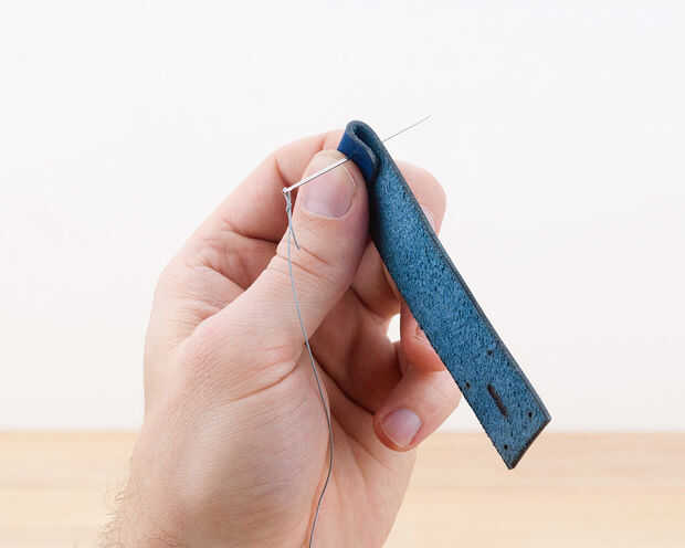• Hará su primera envoltura puntada en el pedazo de correa cuadrada.