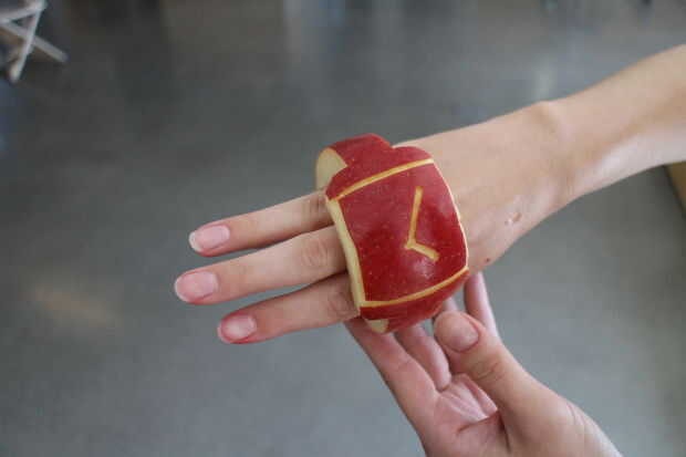 Paso 1: lo que necesita para Apple Watch:1. una manzana (uno mejor grande a ser rojo).knife 2Paso 2: corte el arriba y abajo de la manzana!!Paso 3: hacer un agujero dentro de la manzana como en la foto!!Paso 4: ser creativo hacer reloj analógico o di
