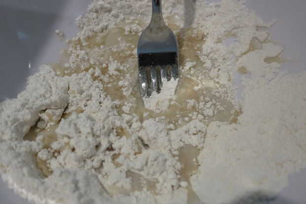 Añadir el aceite y la leche y mezclar con un tenedor hasta que apenas comience a unirse.