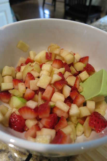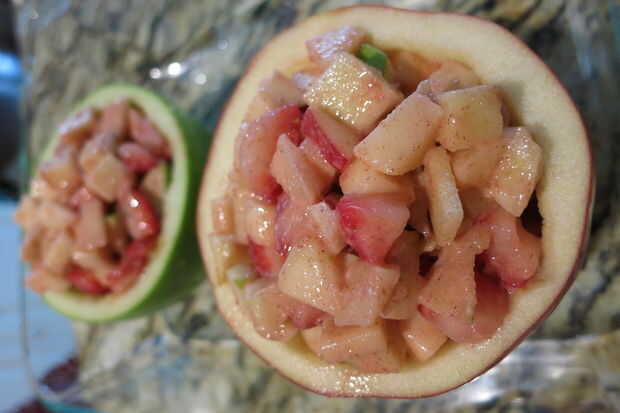 Colocar las manzanas en una fuente para horno y colocar el relleno.