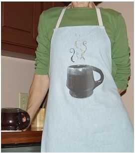 aquí es algo inusual.  Un delantal con solamente un lado.  Y un agujero.Lo bueno de esto es, no tienes que atarla.  Solo lo pones en.  Me gustan los tirantes más amplia y el hecho de que no está colgando alrededor de la parte posterior de su cuello.