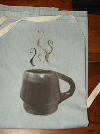 aquí es algo inusual.  Un delantal con solamente un lado.  Y un agujero.Lo bueno de esto es, no tienes que atarla.  Solo lo pones en.  Me gustan los tirantes más amplia y el hecho de que no está colgando alrededor de la parte posterior de su cuello.