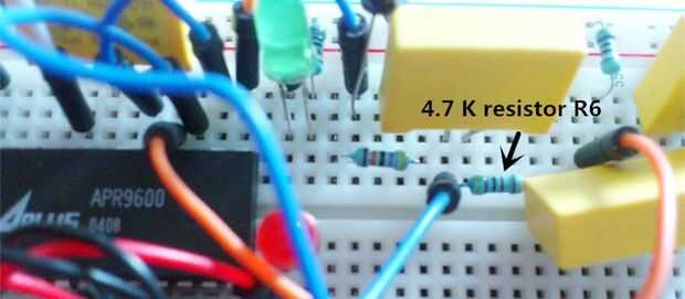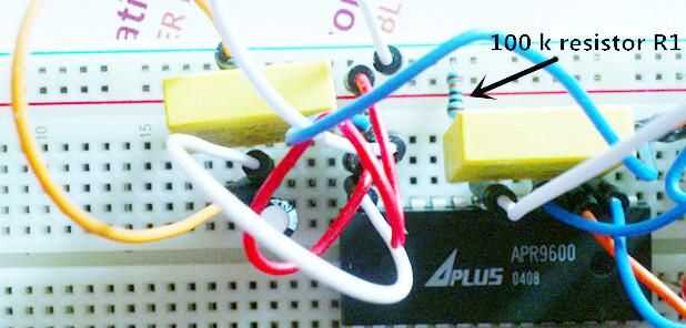 Según el esquema, poner el R1 resistor de 100 K en el tablero de pan y hacer un extremo Conecte pin23 de APR9600 chip de voz. Y luego conecte el otro extremo a la tierra.