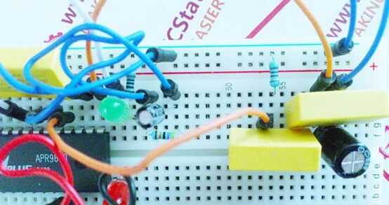 Según el esquema, poner la 0.1uF condensador C1el pan del tablero y conecte un extremo al pin18 del APR9600 chip de voz. Poner la resistencia de 4,7 K R0 en el tablero de pan. Conecte un extremo a la o.1uF del condensador C1 y el otro extremo a la tierra.