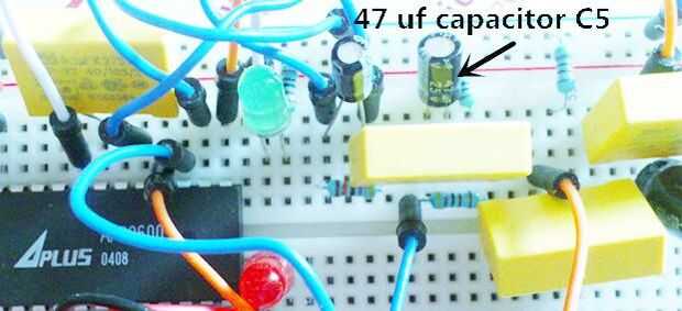 Ponga el capacitor de 47uF C5 en el tablero de pan. Y hacer un extremo Conecte el R6 resistencia de 4,7 K .
