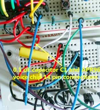 Según el diagrama, conecte el 0.1uF condensador C1 entre el módulo de amplificador de potencia JRC368D a pin14 del chip APR9600 voz.