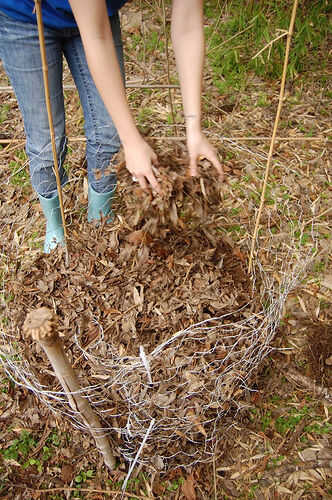 Alternativo añadiendo capas de hojas y el suelo, hasta que el recipiente está medio lleno.