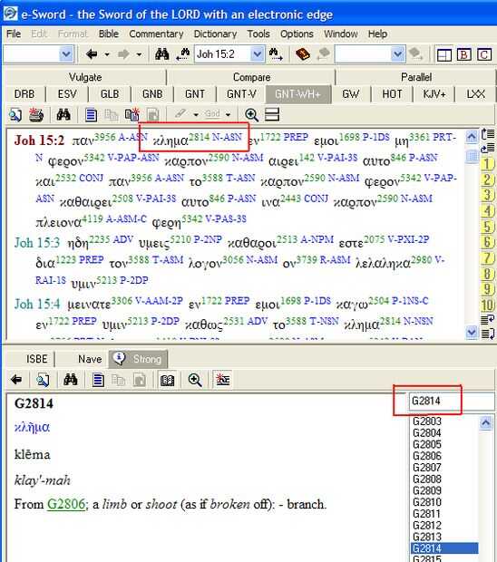 En la ventana debajo de la Biblia texto ventana es la ventana de diccionario. "Fuerte" se destaca en gris. Es Diccionario de Strong. Tenga en cuenta las dos cajas rojas que hice para llamar su atención sobre piezas específicas de información. El superior muestra la palabra traducida en inglés como "rama" con su zona activa número Strong: 2814. Lo después también son algunas letras: N-ASN. Los pasos a discutir lo que los pueden hacer por usted. Sostener por el momento.