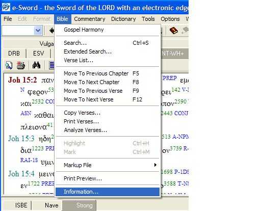 El módulo de Westcott-Hort Greek New Testament (con números de Strong) en e-Sword analiza cada palabra del griego del nuevo testamento para usted. Normalmente, debe comprar un volumen separado y buscar cada palabra desconocida en él. Para utilizar la función de análisis en este módulo, tirar hacia abajo el menú Biblia y seleccione 'Información'.
