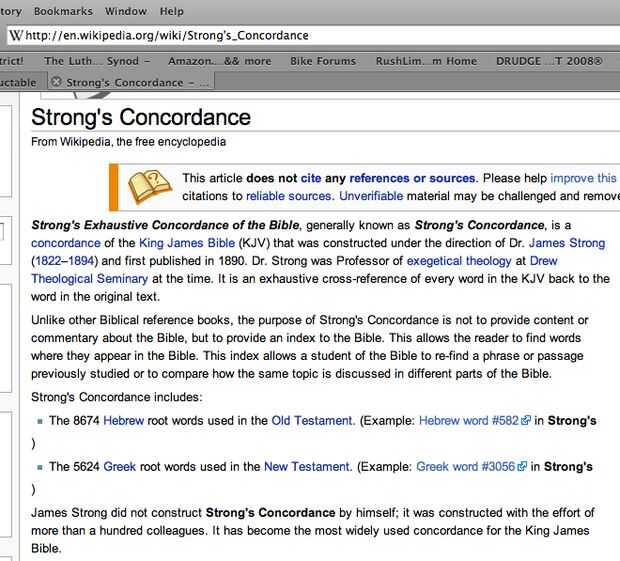 A continuación es una pantalla de un artículo de Wikipedia sobre James Strong y concordancia Strong. Fuerte le asigna a un número a cada palabra de griego y hebreo en la Biblia. Enumeró pasajes de la Biblia agrupados de acuerdo a la palabra inglesa utilizada en la traducción de King James, pero también adjunta la tecla numérica de la palabra en el texto original de cada paso listada. Los usuarios no necesitan saber cómo leer los alfabetos griego o hebreo, ni cómo se pronuncia las palabras originales. Sólo necesitan encontrar todas las entradas con el mismo número y comparar aquellos. Desde el advenimiento de las computadoras, hay muchos programas que le ayudan a hacen electrónicamente. Qué tomó horas con una concordancia de papel encuadernado ahora minutos con un programa de computadora.