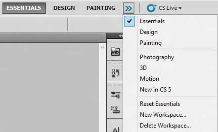 En la parte superior derecha de la pantalla es una opción que nos permite rápidamente seleccionar entre varios espacios de trabajo, los que se construyen en Photoshop CS4 o espacios de trabajo personalizados que hemos creado nosotros mismos. Espacios de trabajo nos permiten establecer diferentes paneles, menús e incluso métodos abreviados de teclado para diferentes tareas. Por ejemplo, puede que desee abren paneles de edición de imágenes y otros paneles abiertos al pintar con pinceles de Photoshop o al trabajar con el tipo. Espacios de trabajo nos permiten configurar la pantalla de alguna manera nos quieren guardarlo y luego seleccionar rápidamente lo alguna vez que lo necesitamos! Photoshop CS5 viene con varios construidos en espacios de trabajo. El espacio de trabajo de Essentials está seleccionada por defecto, pero puede acceder a la lista completa de puestos de trabajo disponibles, incluyendo cualquier los personalizados que haya creado, haga clic en la palabra esencial y seleccionando un nuevo espacio de trabajo de la lista que aparece