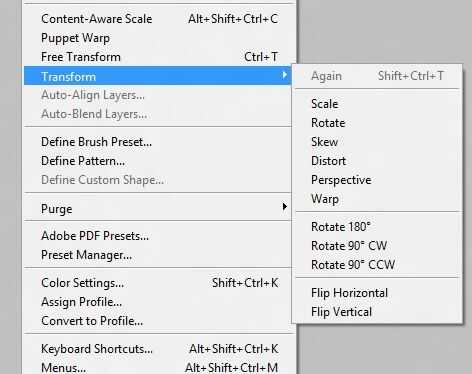 En este menú encontrará los comandos copiar y pegar, opciones de transformación y teclado y menú de configuración de acceso directo, entre otros artículos.