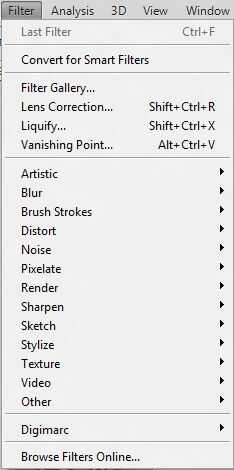 Este menú está lleno de todo tipo de efectos que se puede aplicar a tus imágenes. Grupos de filtros por tipo: artísticos, Desenfocar, enfocar y así sucesivamente. Capítulo 15 cubre filtros en detalle.