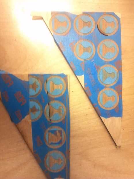 Primer paso, apliqué una cinta adhesiva especial en mi stock de madera. Posicioné en la esquina superior izquierda. Yo pondría un poco a la esquina y los bordes de 1 o 2 dependiendo de la pieza de chatarra. Quisiera trama sólo en la 1ª ronda. Luego, quité la cinta en las áreas a pintar. Entonces, los llevó a la cabina de pintura y había pintado blanco o negro. Con el blanco, se necesitaría una 2 º capa para que el color blanco más blanca. Tomar la cinta de enmascarar en primer lugar antes de cortar las piezas. Así que si cualquier trabajo necesita estar abajo, no será demasiado tarde.