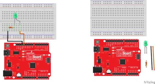 Esta es una ilustración de cómo debe verse el circuito terminado. Componentes como resistores deben tener sus piernas dobladas en ángulos de 90° para poder montar correctamente las tomas de placa.