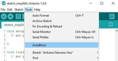 3.-ArduBlock abierto haciendo clic en herramientas > ArduBlock. Si no ves una entrada para ArduBlock aquí, vuelva a verificar para asegurarse de que sus directorios son todo correctamente escritos y entubados.