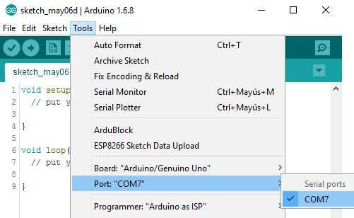 2. - Seleccione la Junta y puerto Serial – justo como lo haría si estaba usando Arduino, seleccionar su Junta y serial puerto en el menú "herramientas".