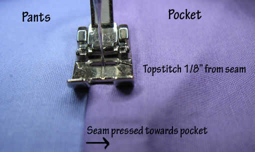 • Doble los pedazos de bolsillo hacia fuera y presione la costura hacia el bolsillo.