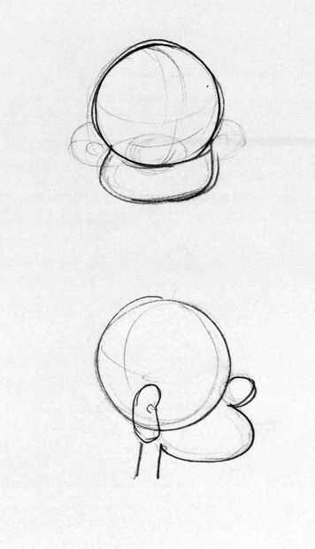 3. lápiz en un óvalo sobre la esfera hacia esa dirección y elegir que forma el carácter va a estar buscando ligeramente (véase la segunda imagen). 4. dibuja dos óvalos para los ojos, escalonamiento de la línea de luz que apenas hecho y añade dos puntos negros para las pupilas.