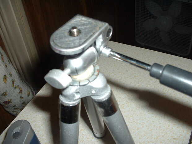 supongo que significa que fue otro proyecto que iba a tener que hacer antes de pudiera llevar conmigo de vacaciones. Tomé distancia y fue capaz de poner una arandela entre la montura y el trípode. Me había puesto 12 marcas lo que he podido encontrar la dirección. Puedes ver la lavadora y las marcas que tuve que cortar con una sierra para metales. Además, tuve que taladrar el agujero hacia fuera el tamaño del eje en el trípode.
